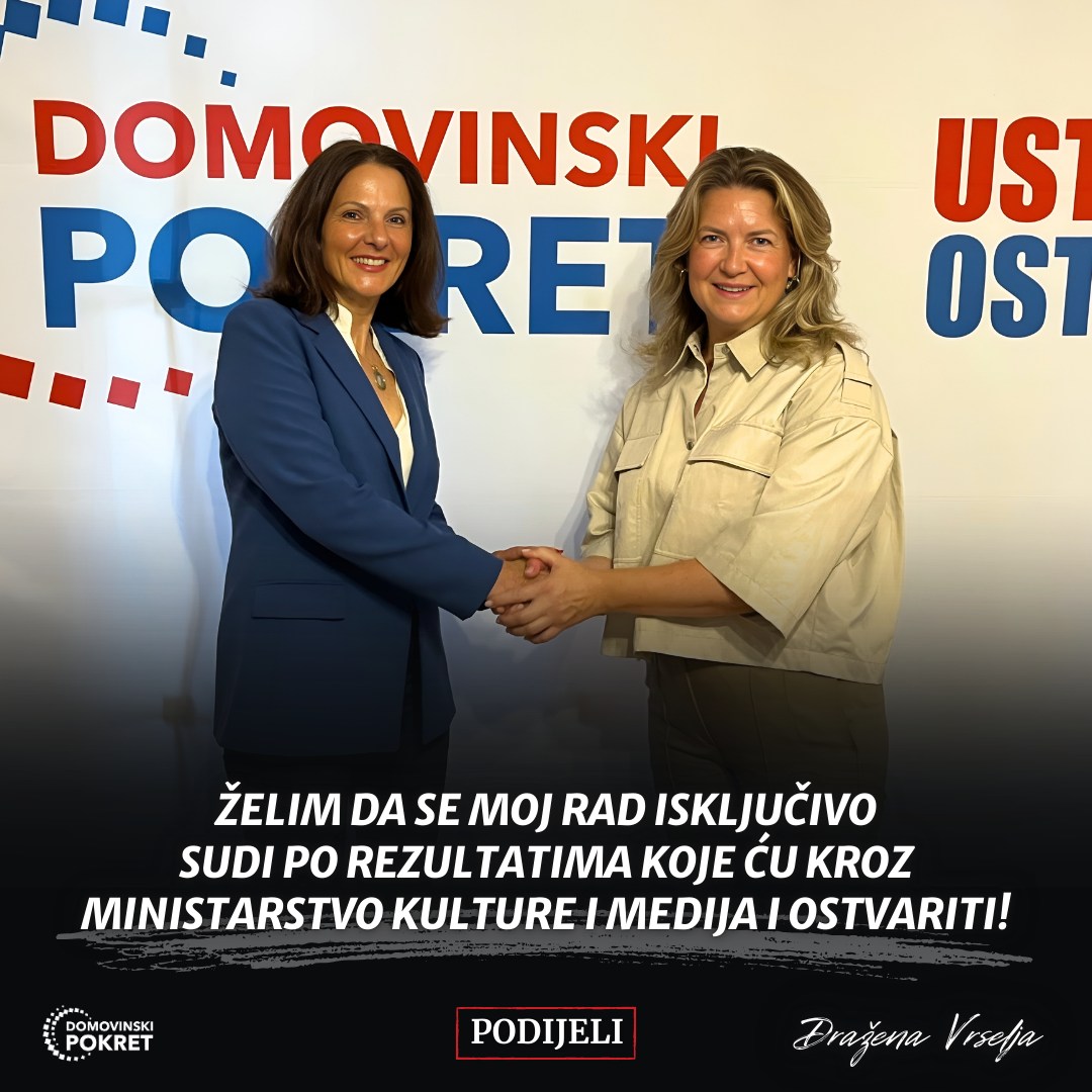 Jesenka Ricl, vijećnica Domovinskog pokreta Gradskog vijeća Grada Osijeka i predsjednica ogranka Osijek, održala je konferenciju za medije na kojoj je predstavila članicu Domovinskog pokreta Draženu Vrselju, imenovanu državnu tajnicu u Ministarstvu kulture i medija Republike Hrvatske.