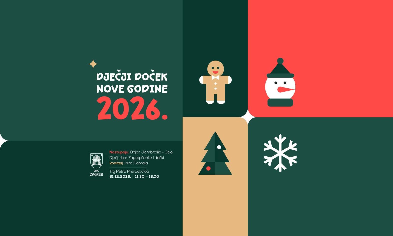 Tražite dječji doček Nove godine u Zagrebu? Donosimo sve detalje o programu 31.12. od 11:30 na Trgu Petra Preradovića uz Bojana Jambrošića, goste iznenađenja i voditelja Miru Čabraju.