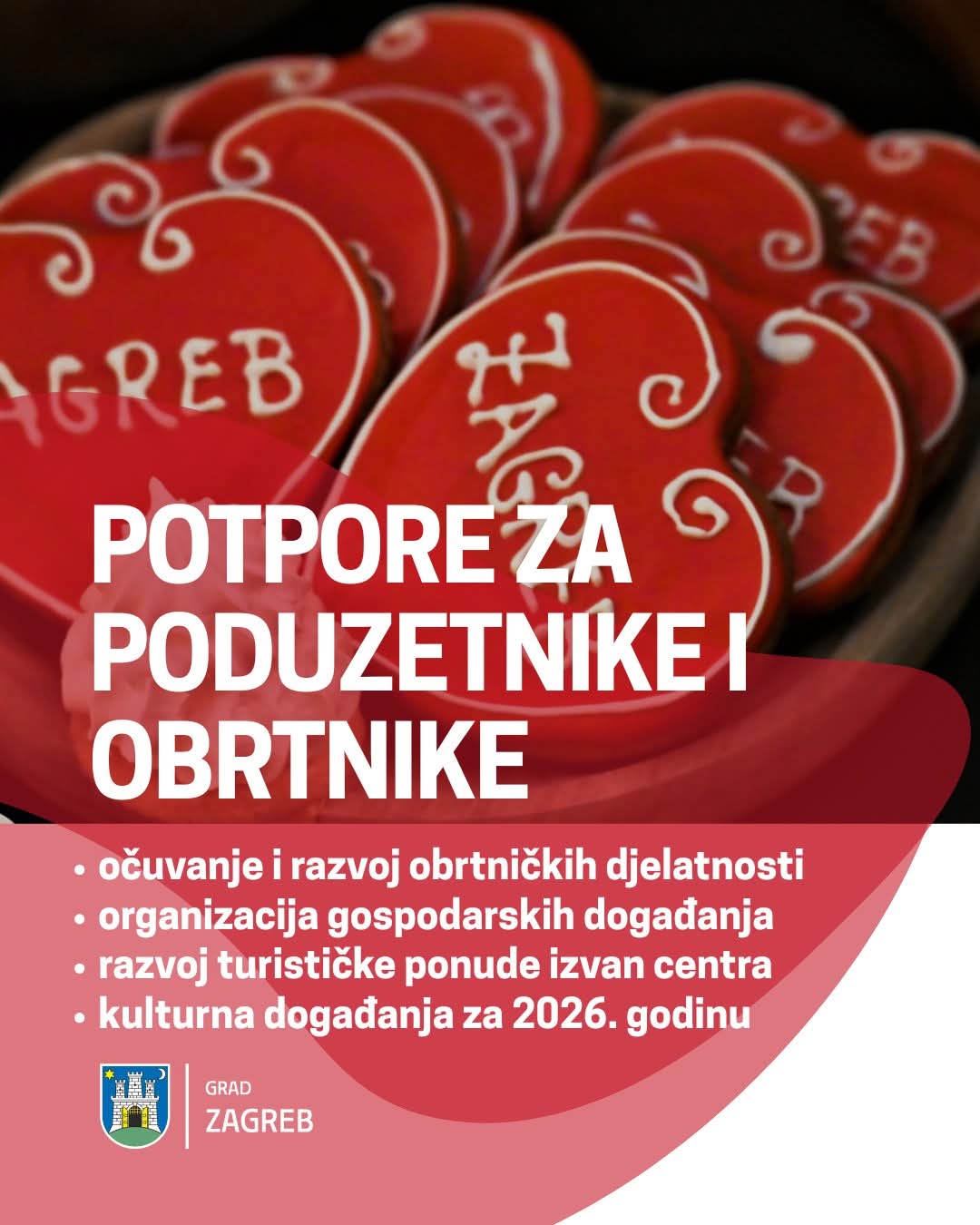 Grad Zagreb objavio je nekoliko aktualnih javnih poziva namijenjenih poduzetnicima, obrtnicima, organizatorima događanja i kulturnim djelatnicima, s ciljem poticanja gospodarskog razvoja, decentralizacije turističke ponude i jačanja kulturne scene. Prijave su otvorene do 30. prosinca 2025., a sredstva se dodjeljuju za realizaciju konkretnih projekata tijekom 2026. godine.