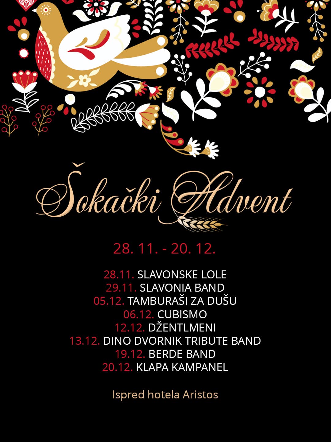 Šokački advent u Zagrebu donosi koncerte Slavonskih lola, Slavonia Banda, Cubisma, Klape Kampanel i drugih izvođača ispred hotela Aristos od 28.11. do 20.12.