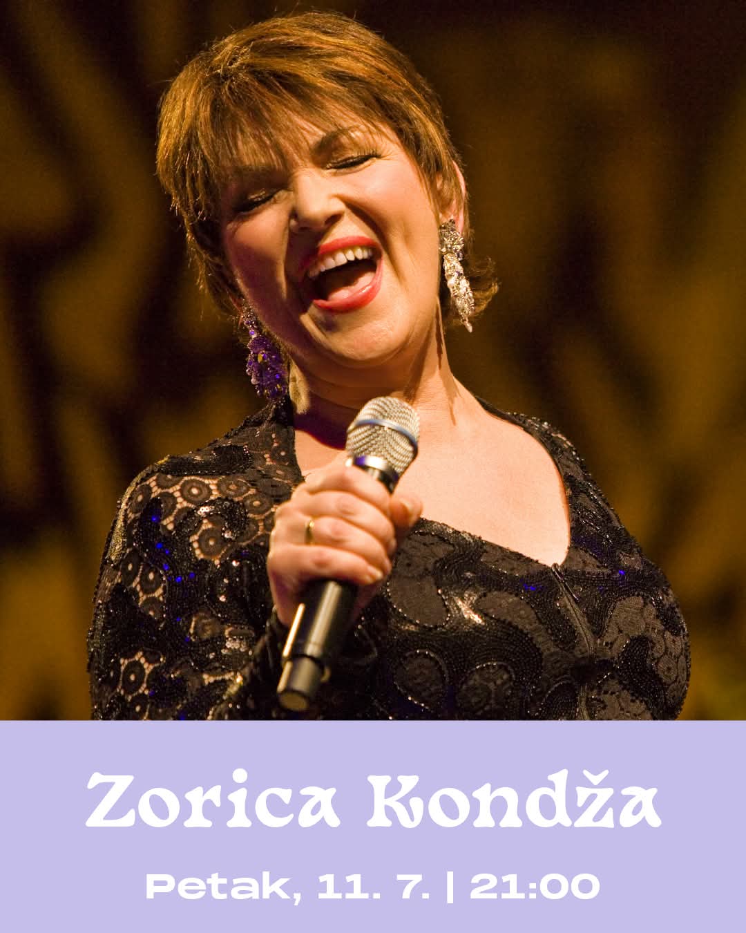Zorica Kondža poznata je po svojoj iznimnoj vokalnoj moći, strastvenim interpretacijama i karijeri dugoj više od četiri desetljeća. Publiku će povesti na glazbeno putovanje kroz najljepše balade, mediteranske evergreene i hitove poput “Zar je voljeti grijeh”, “Vrijeme ljubavi”, “Pokora” i mnoge druge koje znamo i volimo.